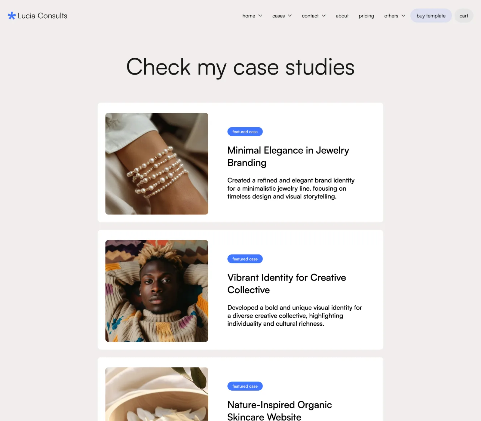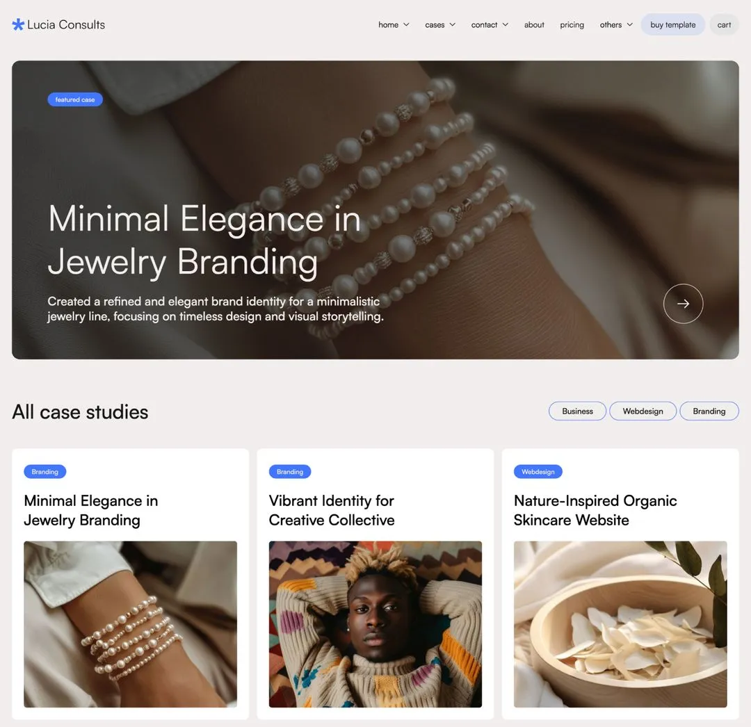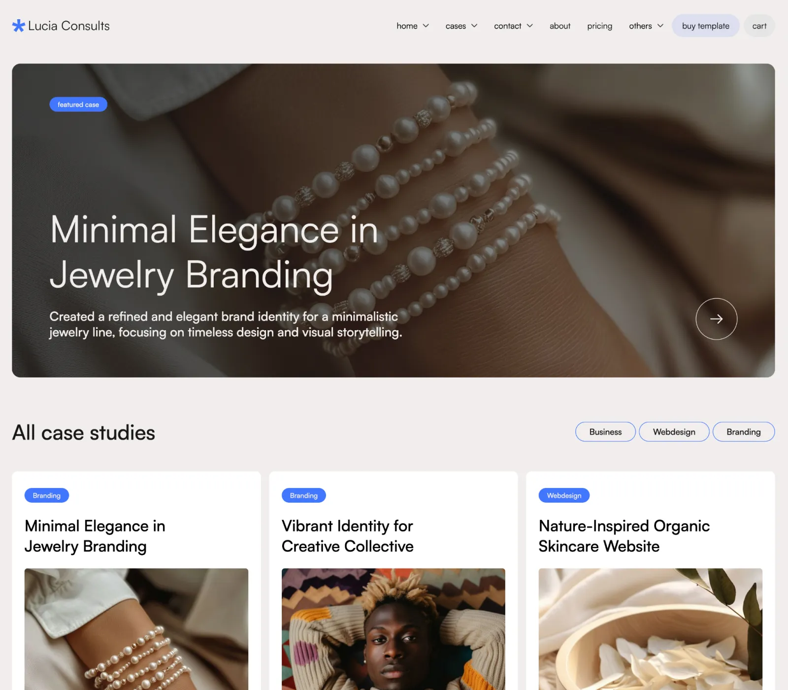 Lucia Consults includes a case studies and case filters collections that are made on the powerful Webflow CMS. This will let you add new content extremely easily.
